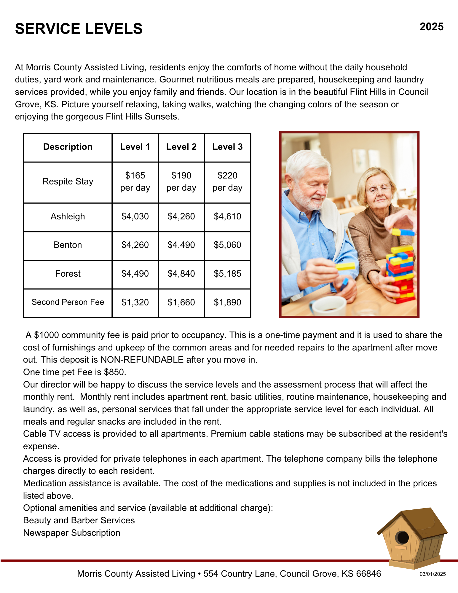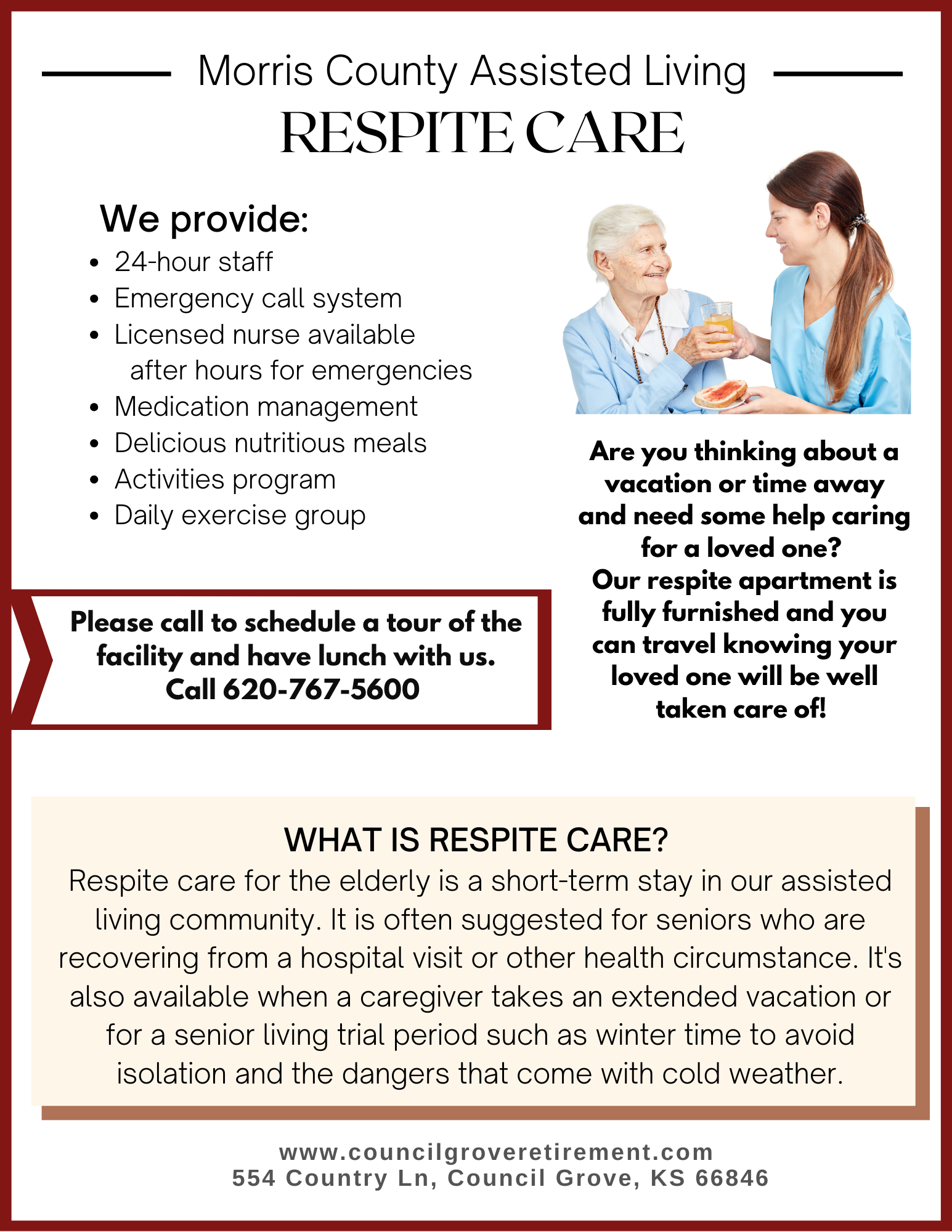 Please call to schedule a tour of the facility and have lunch with us. Call and speak with Laverne at 620-767-5600.